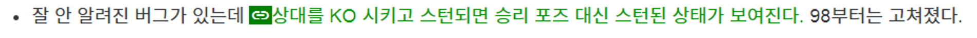 위키의 설명대로라면 KO가 됐을 때 승리포즈 대신에 스턴상태가 되는게 버그이고 KOF98에서는 그걸 고쳤다고 하니까 KOF98에서는 KO 후에는 스턴상태가 나오지 않아야합니다.